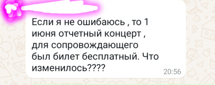 Дочке шесть лет. Ходит на занятия по танцам. Организуют "отчетный концерт" внутри клуба. Снимают помещение в ДК, на другом конце города. "Привозите ребенка к 16.00. Тренер забирает. А Вы, как гость, за билет в 700 рублей заходите в 17.00. Мероприятие длится до 20.00."