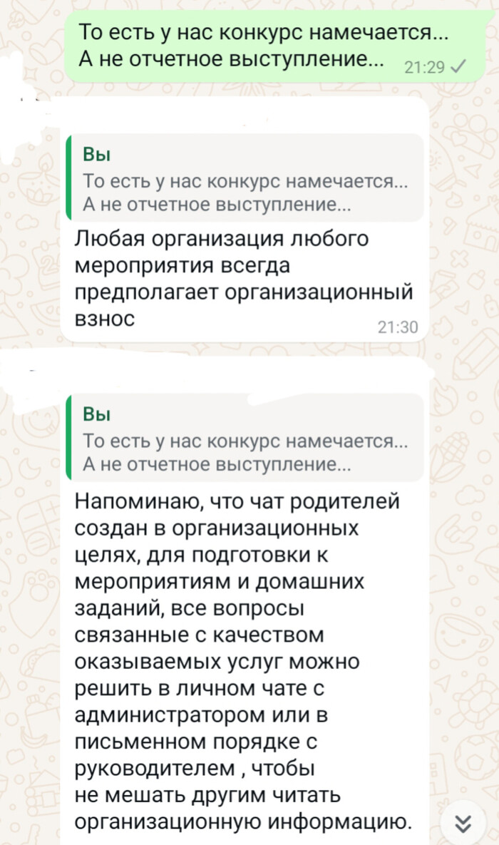 - Но ведь у нас в договоре ни одной буквы нет про ответственность тренера за жизнь и здоровье ребенка. Почему? А потому, что родители через видео связь контролируют тренировку, ждут в раздевалке - сопровождают и это учитывается. А при выездном "отчёте " - покупай билет - никак иначе. Для кого отчёт? Кому? Собираются только дети и родители... При этом я не против купить билет для своих знакомых/друзей, которых позвала."