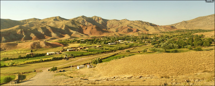 Попасть в селение архисложная задача. Вернее можно конечно нанять машину, но это обойдется в солидную копеечку, и нанимать необходимо лучше внедорожник, потому что после поселка Койтен (Койтендаг) вас будет ожидать ужасная дорога и солидный набор высоты на всем протяжении пути. Ходжапиль расположился в симпатичной горной долине на высоте 1200-1300 метров. На спутинковом снимке долина выделяется "зеленью" садов и огородов (говорят тут выращивают отменные помидоры), а к ней со всех сторон подступают разноцветные юрские и меловые горы. На снимке отчетливо можно разглядеть и интересующий нас объект - плато Динозавров.