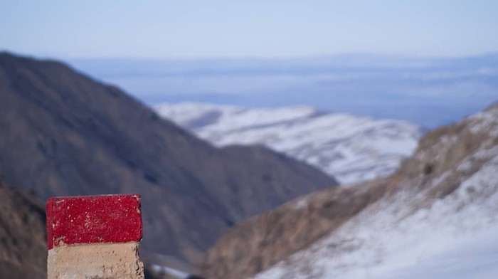 С плато открывается шикарный вид на горы и на долину, на дне которой находится поселок. За спиной Узбекистан, впереди за горами - Узбекистан, справа - Узбекистан.
