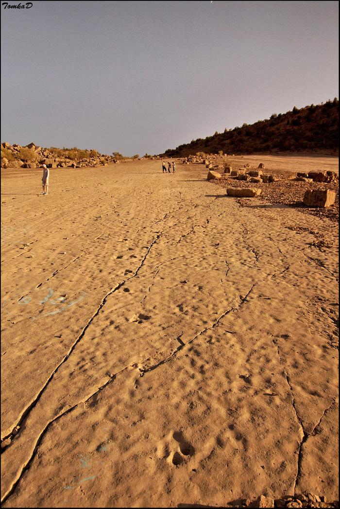 На крайнем юго-востоке Туркменистана, окруженный с трёх сторон горными хребтами за которыми уже находится Узбекистан, расположился небольшой горный поселок Ходжапиль, название которого переводится как "Священные слоны". В трех километрах юго-западнее от Ходжапиля на высоте около 1800 метров находится наклонная известняковая плита размерами 400*300 метров. Эта плита буквально истоптана следами динозавров, обитавших на земле в Юрском периоде (140-150 млн лет назад). Хорошая степень сохранности следов, а также их количество (более 3000 тысяч!!!) делают плато уникальнейшим местом, не имеющем аналогов на нашей планете! Более того, плато и по сей день хранит в себе интересные секреты и загадки, которые официальная наука старается замалчивать и обходить стороной. Все мы знаем, что человек существует не более чем 3 млн лет, но что мы можем сказать, когда видим отпечаток человеческой ноги запечатленный рядом с огромным следом древнего ящура?