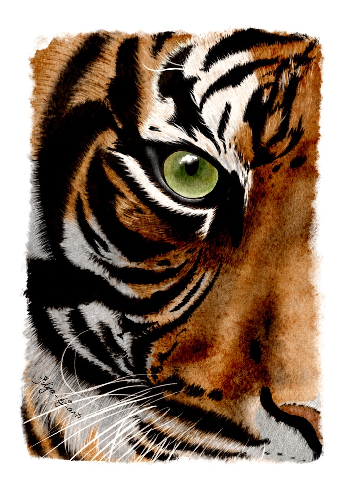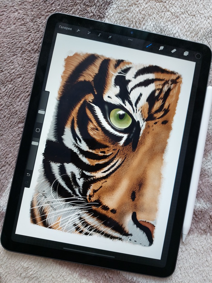 Пока не определилась, что конкретно мне нравится, рисую и портреты по фото, и стикеры и скетчи с эффектом акварели. Всё в растре. Сегодня вот половинка тигра. Будет открытка.