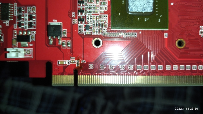 P.s забыл написать что при запуске она не определяется, то есть в диспетчере устройств её нет... Конденсатор в верхнем углу был впаян который был примерно похож. На чипе нет пластиковой защиты т. к. я её снял на время чтобы не падала. Из того что сделал я это около линии PCI express впаял конденсатор(вроде он так называется(маленькая штучка с жёлтенькой полоской по середине)).Пожалуйста если хотите объяснить, то объясняйте как своей бабушке))