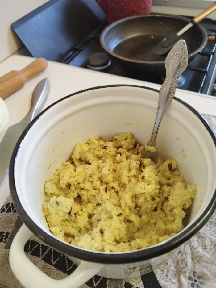 4. Картофель разминаем вилкой или толкушкой. Смешиваем с луком, солим, перчим. Первая начинка готова. В неё я и буду запихивать сюрпризы.