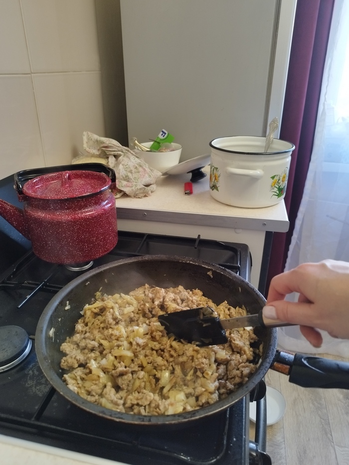 6. Добавляем фарш, соль, перец и обжариваем всё это вместе. Вторая начинка готова. В неё я ничего запихивать не буду.