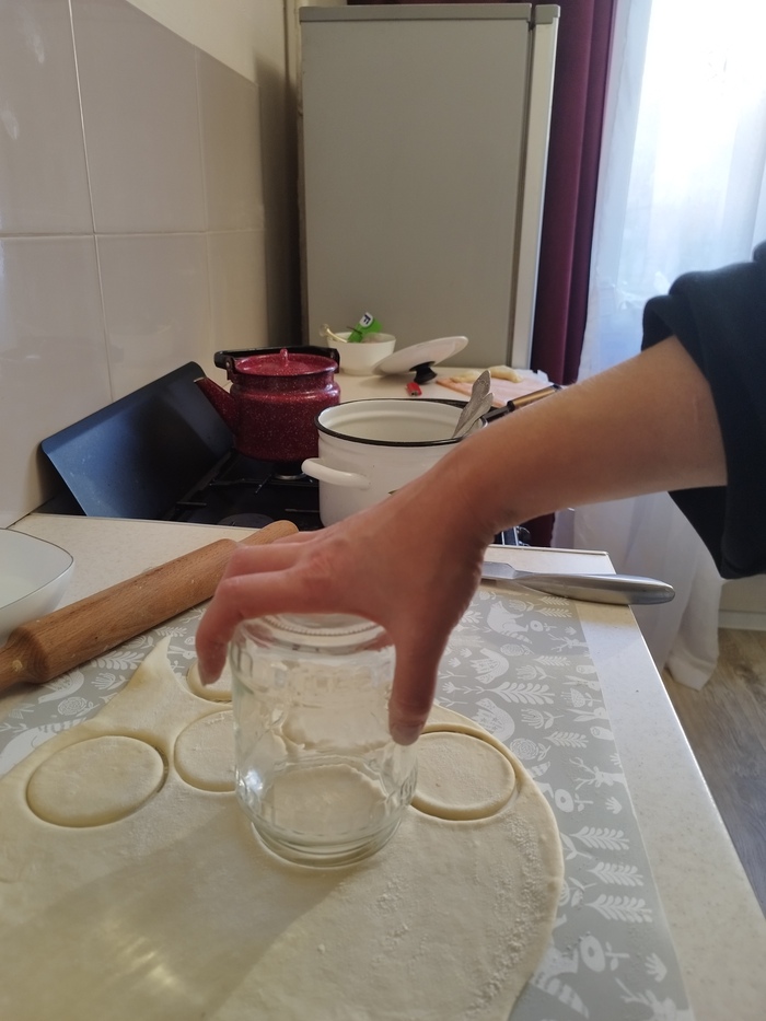 7. Возвращаемся к тесту. Достаем, разминаем, на сухой поверхности с мукой, раскатываем. Выдавливаем кружочки подходящей формой.
