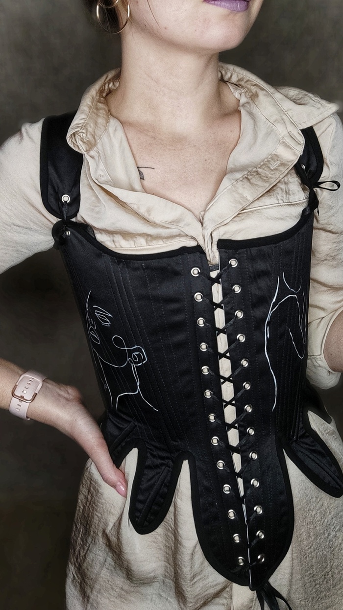 Но сегодня хочу поделиться еще одним вариантом корсета. В историческом стиле, со шнуровкой спереди и сзади и дополнен фестонами по низу. Смотрится небанально, и хоть шить было трудно, уйма работы выполненной именно вручную, но результат приятно удивил. В дополнение хотелось как-то его украсить, было задумано нанести рисунок краской спереди. Что тоже делала впервые, но буду работать и развиваться и работать в этом направлении.