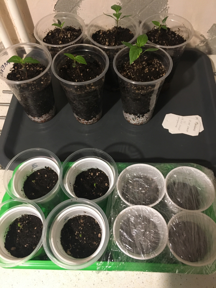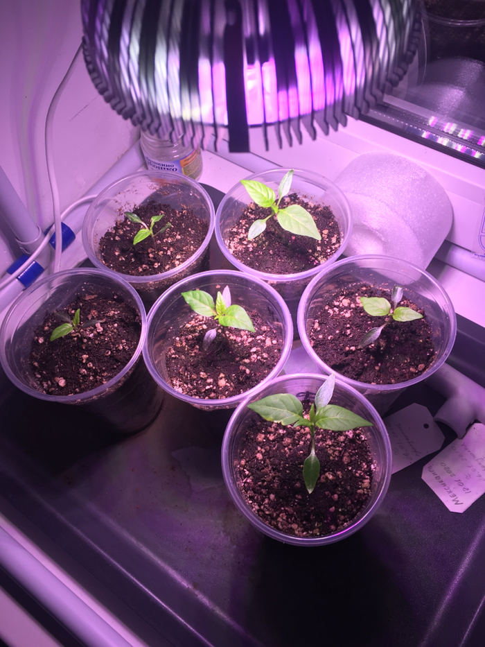 я попутно с лампой заказал семян Хабанеро, Табаско, Нага Морич, и ещё что то). Свою посадку я накрыл пакетом и поставил в темное место. А затем уехал в командировку на две недели. Приехав с командировки я увидел вот это. Они явно просились наружу, да и любимая про них чутка забыла, но не суть))😀Главное ведь они проросли!
