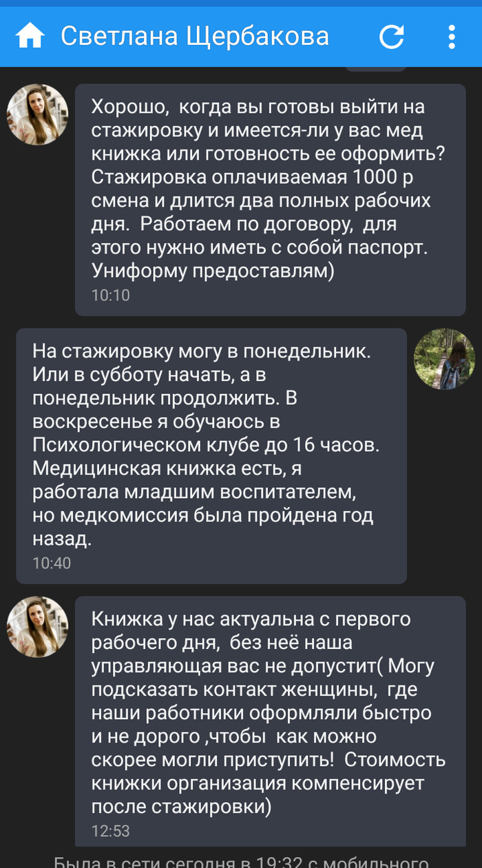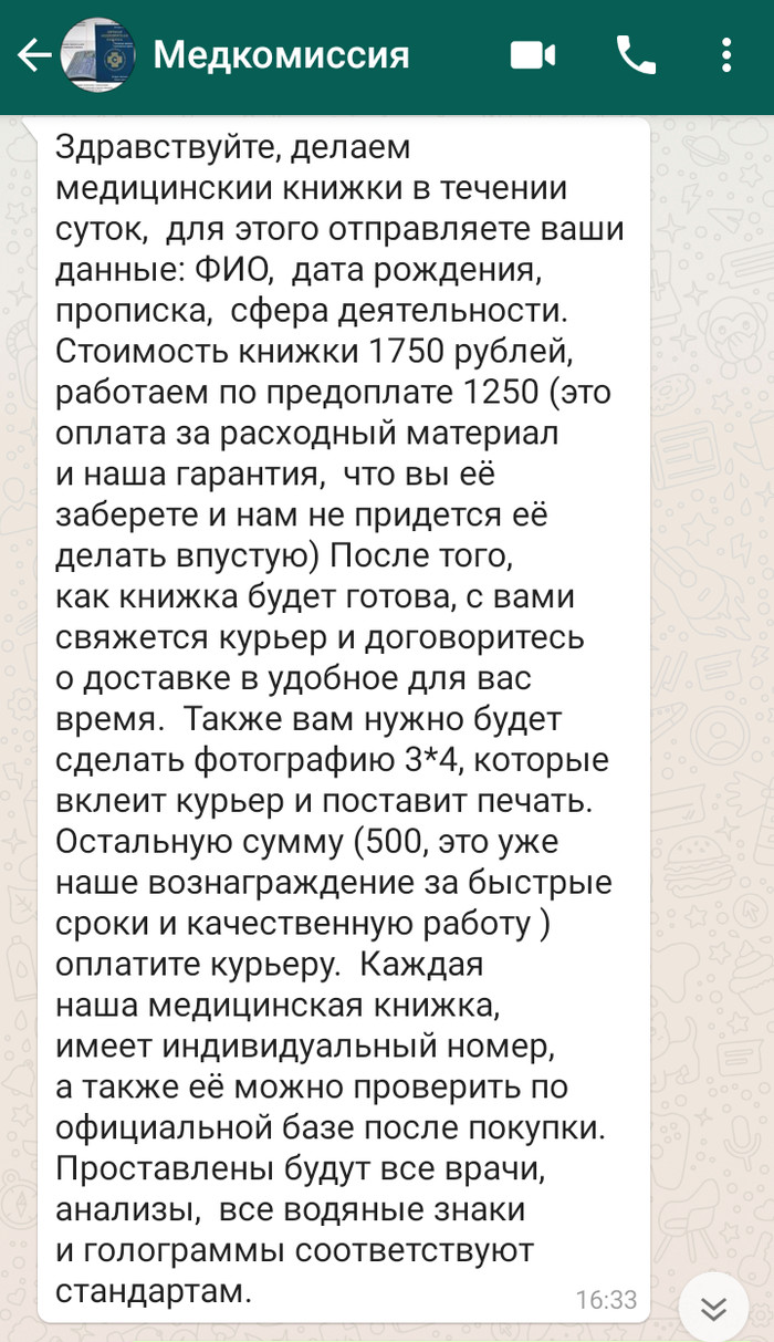 Думаю, как круто! Придумала резюме, отправила, меня пригласили на стажировку, расхвалив резюме. Но сказали, что нужна медкнижка. Так как у меня ее нет, я взяла у них контакт, где можно быстро пройти медкомиссию. В итоге мне предложили купить книжку по небольшой цене. 1500. Окей. Думаю, не правильно, но в даже если на работу не устроюсь, пригодится.