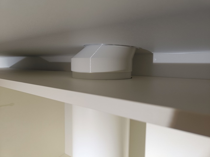 Вытяжка изначально планировалась под 125 трубу. А куплена была под 150у. Т.к. точка подключения и вырезы в шкафах оказались не соосны (о причинах в конце), а о гофре и речи быть не могло, изготовил эксцентриковый переход, 3Д печать опять же: