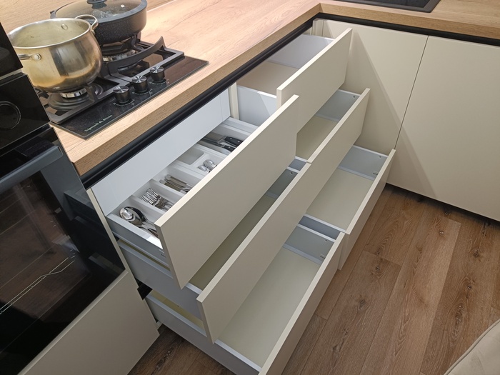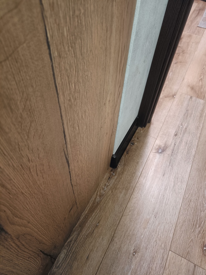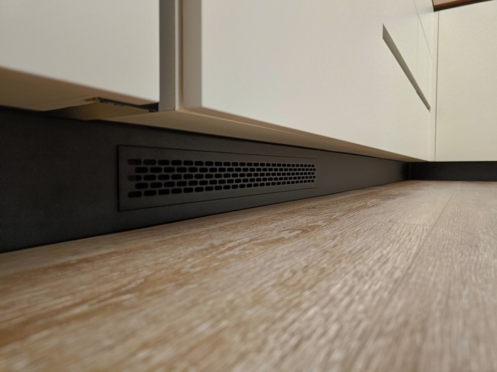 Цокольная планка установлено достаточно глубоко, в первую очередь из-за ПММ, не хотелось делать подрезку, а фасад на ней не скользящий. Плюсом ноги не упираются в него: