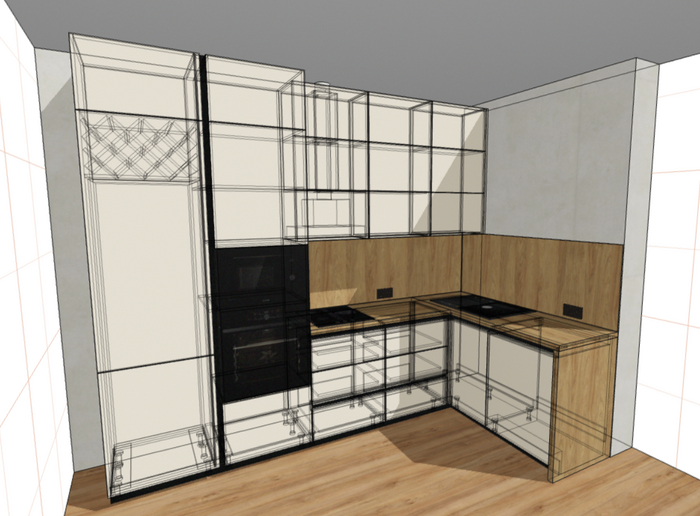 Заказал распил корпусных деталей, фасады, столешницу и панели на местном производстве. Заказаны вырезы под профиль Gola, трубу вентиляции и заднюю стенку. Понеслась: