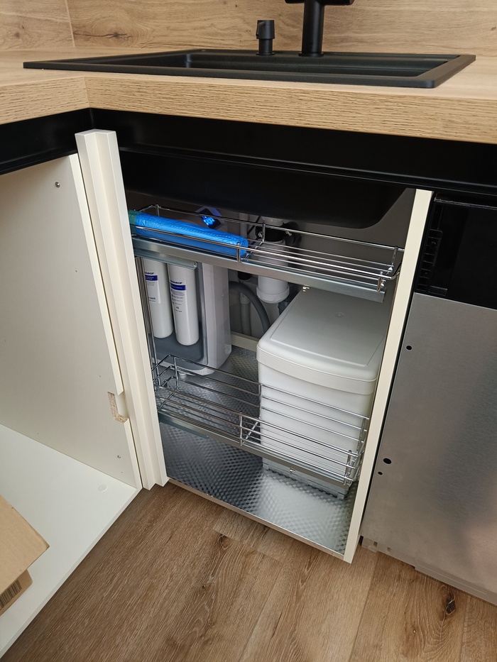 Второе это корзина под мойкой, не учел высоту мойки, вообще про нее не думал. И это хорошо, иначе корзину бы не купил. А выкрутился подрезкой на корзине высоты верхнего бортика.