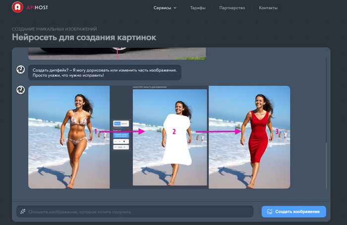 Apihost — генератор изображений, который поддерживает вставку людей в сцены с помощью текстовых запросов и имеет удобный интерфейс.