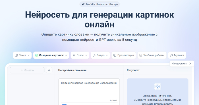 Генерация изображений встроена в универсальный ИИ — сразу видите результат, не переключаясь между сервисами.