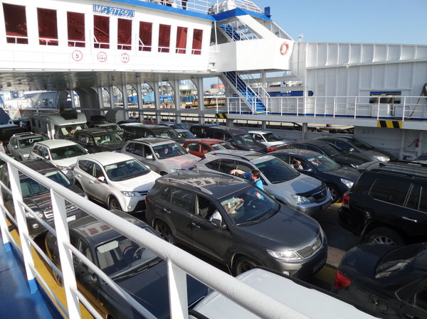 Паром был прекрасным развлечением, для меня это был первый раз, и мне очень понравилось. Билеты на паром необходимо покупать заранее, пусть даже за пару дней – это избавляет от необходимости стоять в очереди в кассу на месте. На офсайте парома необходимо зарегистрироваться, ввести все данные по машине и людям, и оплатить билет. Для скорости оформления лучше распечатать билеты на бумаге. Стоимость – 1700 р за легковушку и по 150 за человека.