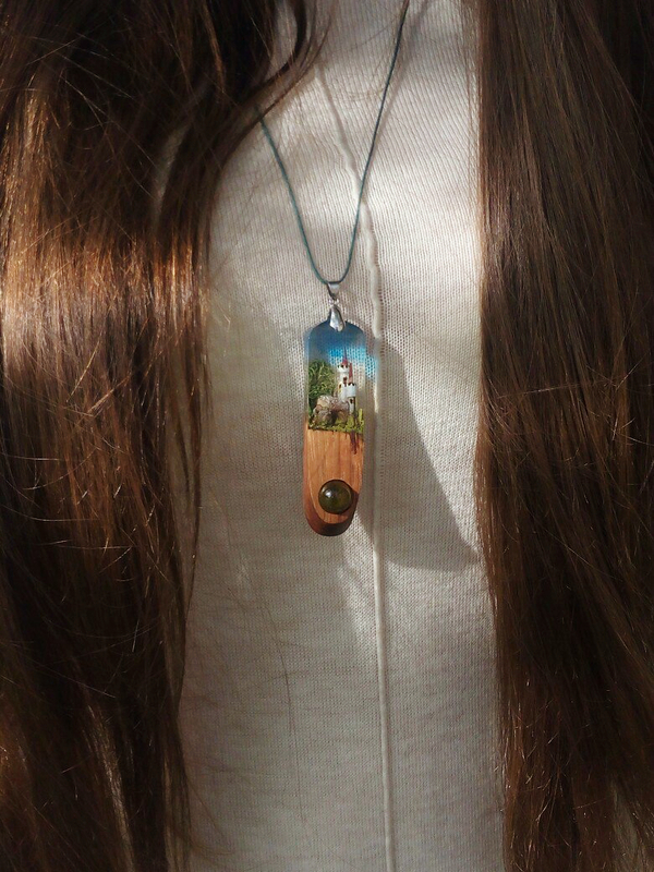 Кулон с этих фото-действительно выстраданный,ибо решить его итоговый вид предстояло сразу трем людям-двум мастерам и будущей хозяйке.Дорабатывался он нервно,кому-то хотелось скошенный край,кому-то-затемнить деревянную часть.В итоге вышло то,что вышло)За пару часов до вручения решено было добавить стеклянный шарик под композицию..