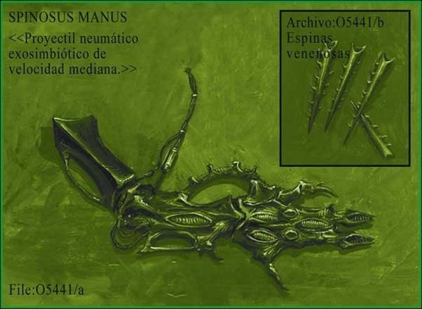 Это оружие, используемое обычными войсками тиранидов, является инкубатором. Внутри живет большой выводок жуков-точильщиков, которые, когда повзрослеют, содержаться в ступоре при помощи гормонов. Эти жуки вылупляются и вырастают внутри оружия и, похоже, проводят всю свою жизнь внутри него, пока в них не возникнет нужда. Носитель нервным импульсом дает оружию сигнал переместить одного из жуков в стрелковый сфинктер. Попав туда, жук пробуждается ото сна и ждет биоэлектрического сигнала к атаке. Похоже, что эти слепые жуки возникли в результате генной инженерии; их надкрылья устроены так, чтобы предотвратить любое значительное отклонение от траектории полета. По получении сигнала к атаке сфинктер открывается, позволяя жуку помчаться к цели. При попадании жук, упрямо цепляясь, начинает выделять пищеварительные энзимы и использует свои мощные челюсти, чтобы забуриться в цель. Все это происходит молниеносно и яростно. Эта деятельность продолжается, пока небольшие энергетические резервы жука не исчерпаются, и он не умрет от истощения, или пока какая-нибудь травма не прервет его короткую и неистовую жизнь.