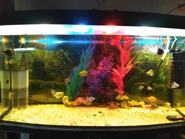 Привет! У меня дома есть много живности. Начнём с рыбок. У меня дома стоит 3 аквариума: один 400 литров, второй 300 литров, а третий совсем маленький, 30 литров. На подоконниках в каждой комнате стоят растения: в общем счёте их около 20 штук. Так-же у меня есть кошка, сирийский хомячок и две улитки ахатинки. Ниже их фото и небольшое описание некоторых зверей..