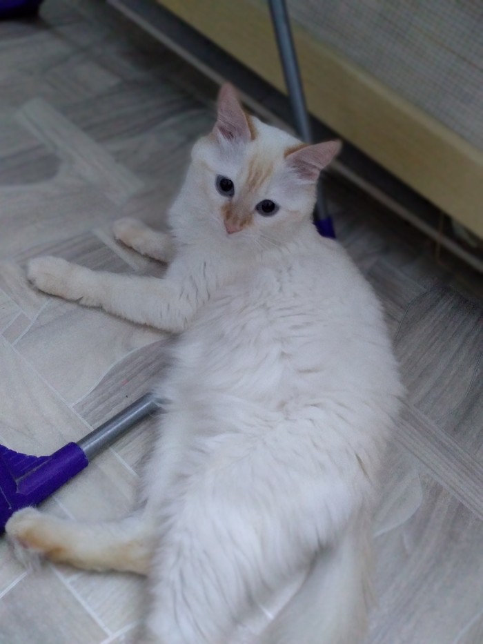 Сиамская кошка, где-то 6 лет. Имя:Соня(потому, что много спит). Ночью любит лечь на подушку на которой я сплю, будит по утрам. (ночной тыгыдык-тыгыдык отсутствует)Ревнует меня к хомяку.