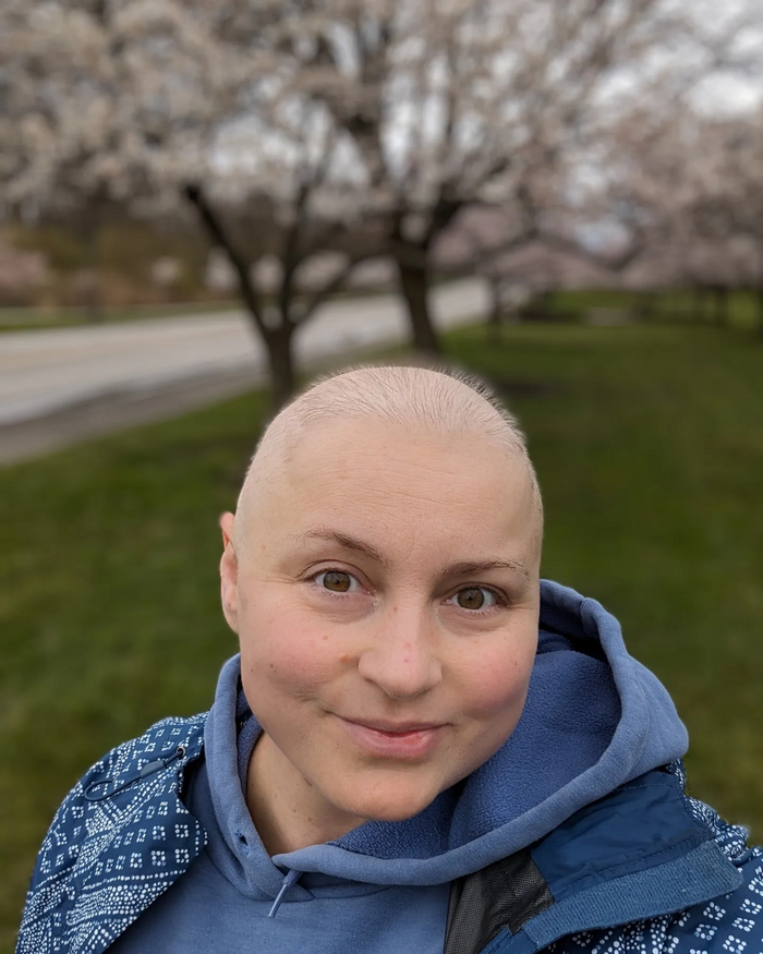 К последнему циклу химии я полностью облысела, потеряла брови и почти все ресницы. Набрала за время лечения 10 килограмм. В общем, округлилась во всех местах. Выгляжу теперь как Шалтай-Болтай. А ещё я могу похвастаться кожей оттенка питерского неба в осенне-зимний сезон. И кругами под глазами.