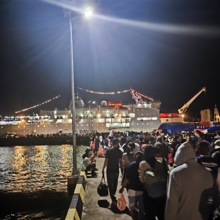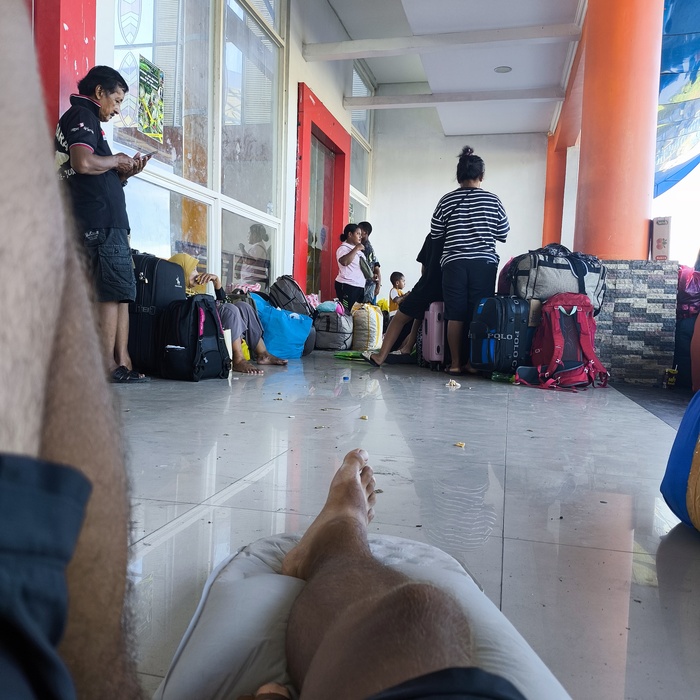 13:55. На месте. Корабля, ожидаемо, нет. До него ещё часов пять, а меня ломает слабость. Разбавил в бутылке воды местный сироп из мёда, имбиря и кучи других трав. Должно полегчать. Называется он Tolak Angin. Angin в переводе с бахасы означает «ветер».