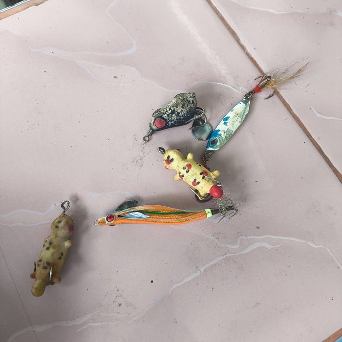 Рикки, увидев мои рыболовные снасти, достаёт свои приманки для спиннинговой ловли — яркие, странные, будто советские ёлочные игрушки. Украшения!