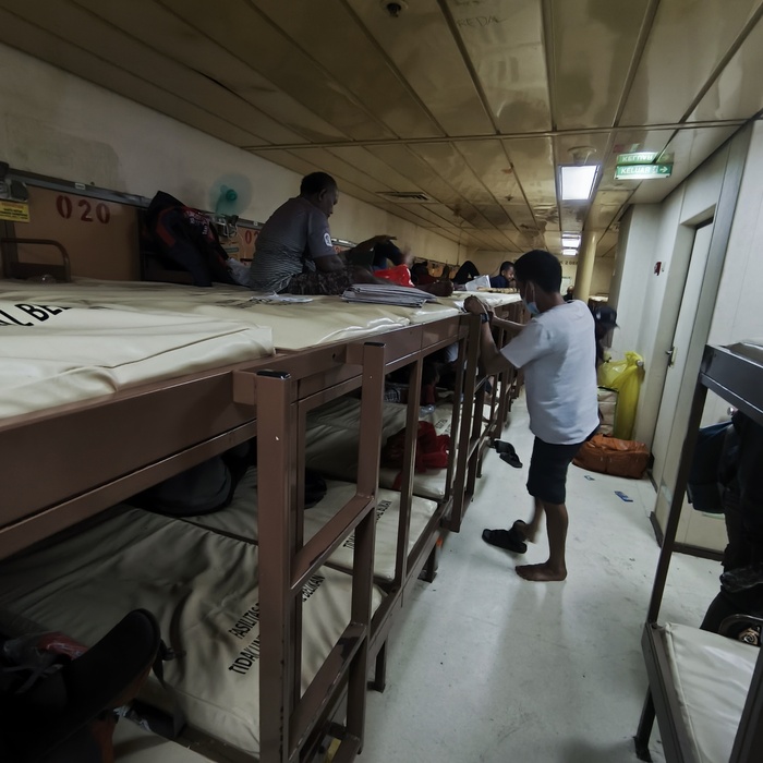 Внутри всё как обычно — кто-то ищет свою каюту, а кто-то располагается на полу. Максимально бюджетно.