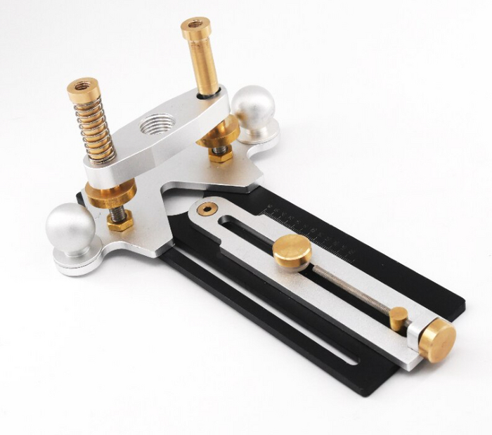 Движущая часть шаблона фиксируется при помощи винта с ребристой головкой. Магниты установленные в торце оснастки позволяют надёжно фиксировать измерительный инструмент на металлическом основании стола фрезерного и циркулярного станка на время настройки.