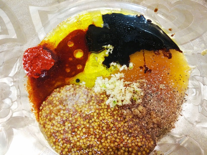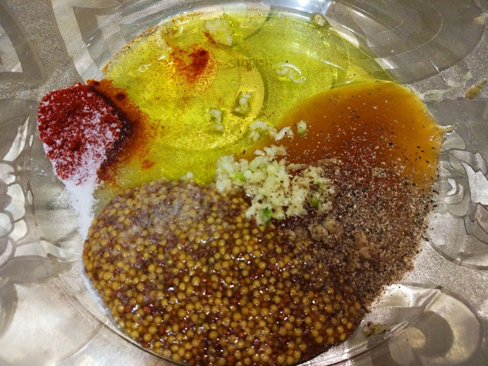 1. Смешиваем оливковое масло с паприкой, солью, горчицей, перцем, чесноком, мёд