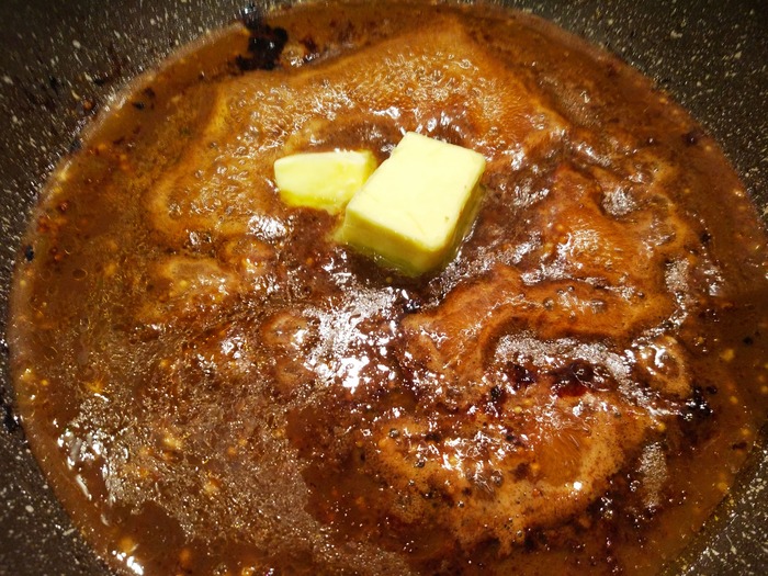 5. Переливаем маринад от мяса в сковороду, добавляем сливочное масло. Выпариваем, чтобы маринад стал гуще