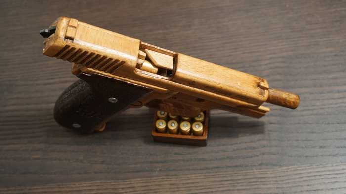 На модельке есть система имитации отката затвора и выброса гильз. Стреляет резинками.