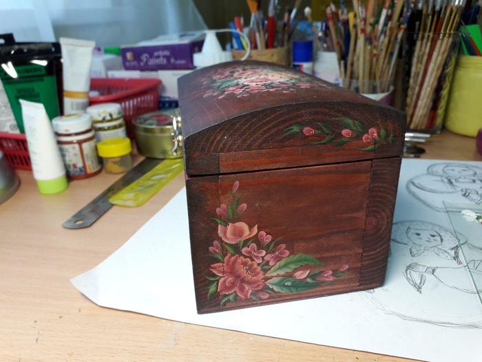 Бока было жутко неудобно расписывать. В основном потому, что расписывала оба одновременно и несколько раз смазывала. Еще, когда располагаешь сундук на ребре, он неустойчив и поверхность расписываемая слишком высоко, так что пришлось немного повозиться с этим