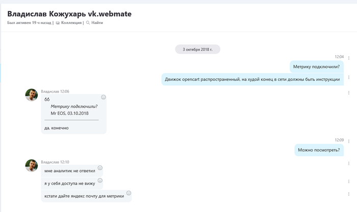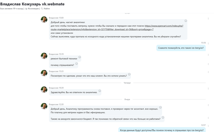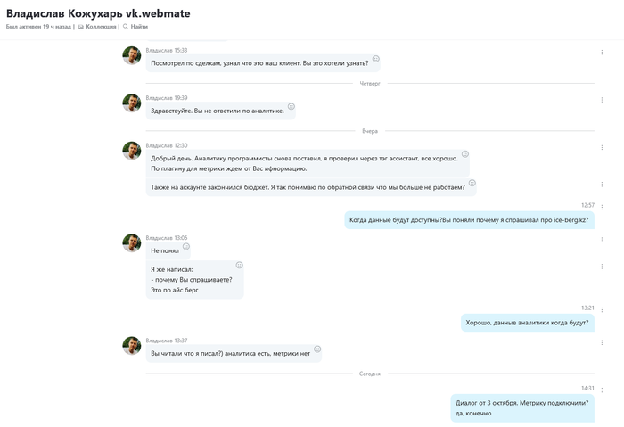 Далее приложу скрины переписки, где Владислав сначала говорит, что метрика есть, а через 10 дней ее не стала. Это как со стенкой говорить.