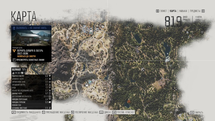Он поделен на четыре больших локации, в каждой из которых находится база выживших и куча разных объектов.