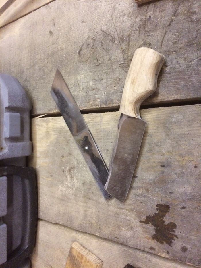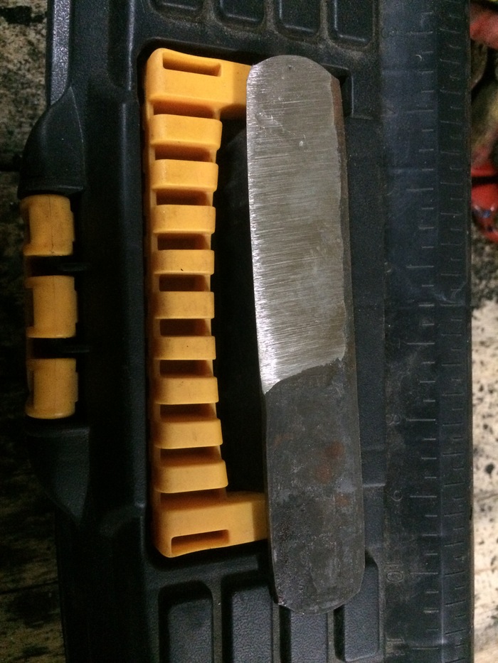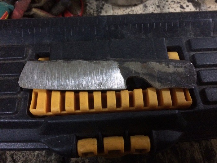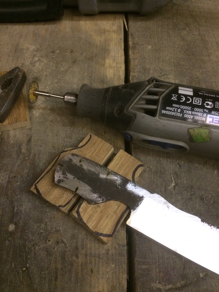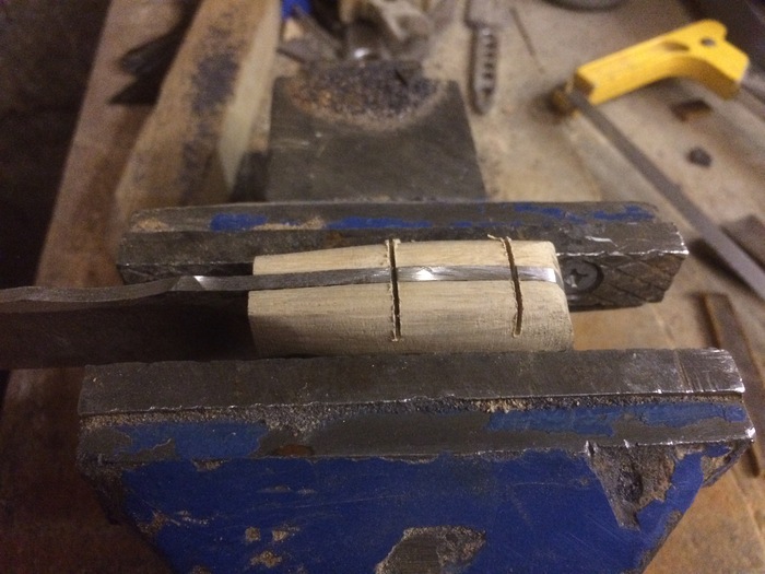 Опять очередь тисков и ножовки по металлу. Расширяем прорези по всей толщине рукояти.