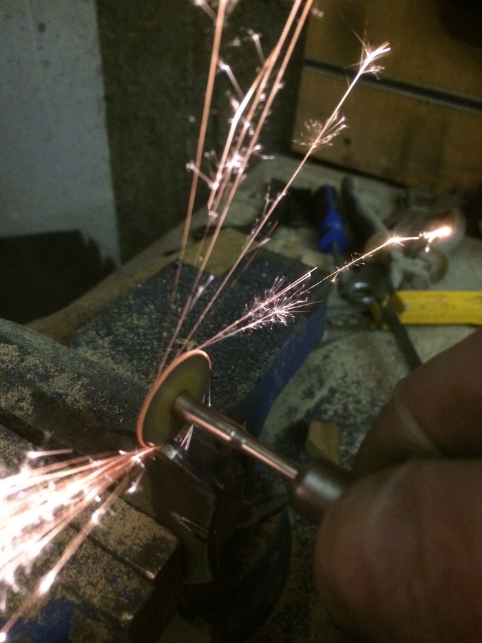 А вот дальше интереснее. Так как крепить эти плашки на сталь мы будем не совсем типичным образом. Обычно делают трубки или заклёпки, иногда винты. Мы же поступим иначе. Для начала закрепляем заготовку в тиски и берем дремель с отрезным кругом и делаем несколько поперечных пропилов глубиной 5 мм по периметру заготовки.