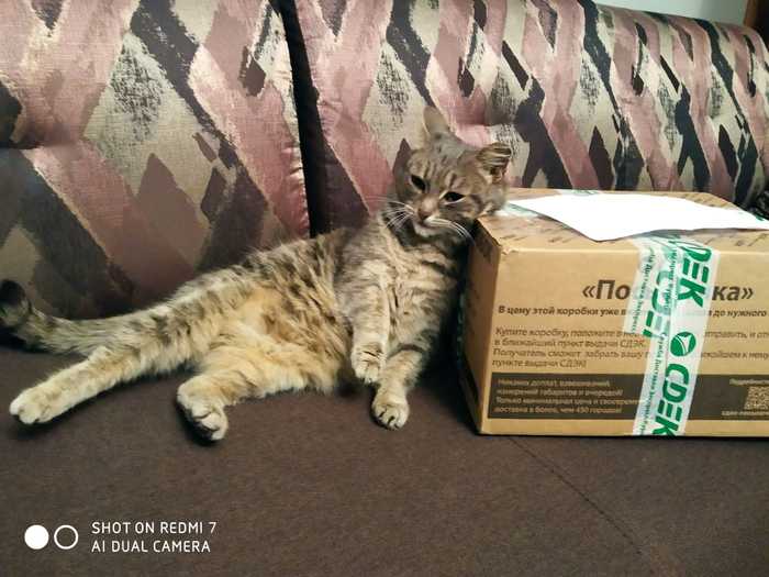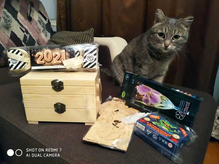Начитавшись постов, стараемся не нарушать традицию и начали исследование подарков с котоинспекции, в нашем случае, кошкоинспекции, т.к.это наша любимица по кличке Муся.