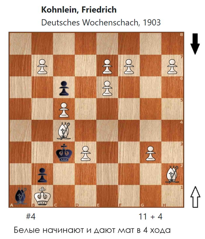 Нашёл вот такую, достаточно необычную (решите - увидите в чём её необычность) композицию с четырьмя проходными пешками из немецкого журнала 1903 года "Deutsches Wochenschach" за авторством шахматиста и проблемиста, уроженца Нюрнберга, Фридриха Кёнлейна (Friedrich Köhnlein, 1879 - 1916). Чтобы поставить мат чёрному королю, белым разрешено сделать не более четырёх ходов.