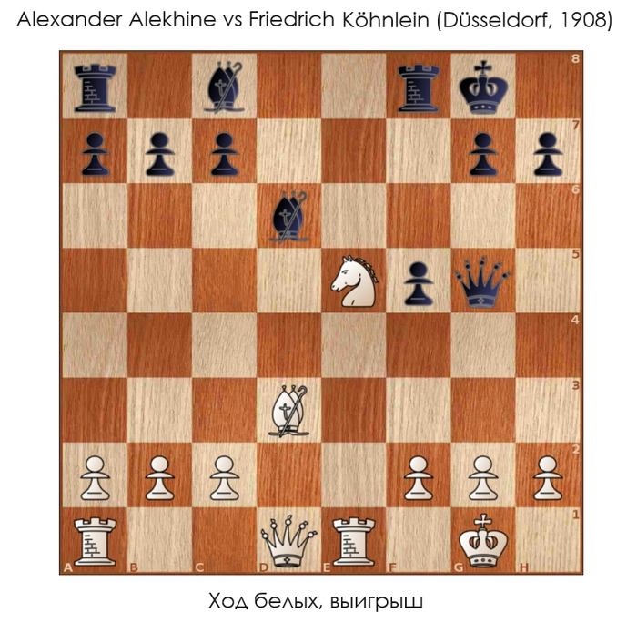 P.S. В 1908 году Фридрих Кёнлейн выиграл побочный турнир 16-ого конгресса Германского Шахматного Союза в Дюссельдорфе, при этом проиграв партию Александру Алехину, сдавшись на 17-ом ходу. Ниже положение в этой партии после 14-го хода чёрных. Как бы вы сыграли за Алехина, у которого были белые фигуры?