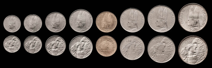 Павел VI, 1964 год, второй год правления этого понтифика. 1,2,5 и 10 лир алюминиевые монеты. 20 лир - алюминиевая бронза, 50 и 100 лир - нержавеющая сталь. 500 лир серебро 0.835.