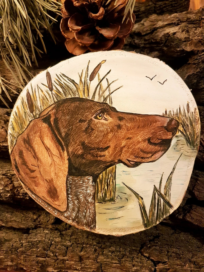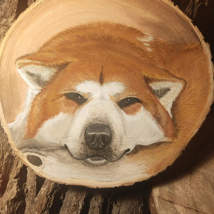 Через пару лет я завела собаку и именно эта мохнатая морда мне подала идею, а что если рисовать собак на больших срезах?! И правда идея понравилась не только мне, но и людям, стали приходить заказы, что не могло не радовать, а чем больше работы, тем лучше становится качество рисунка!