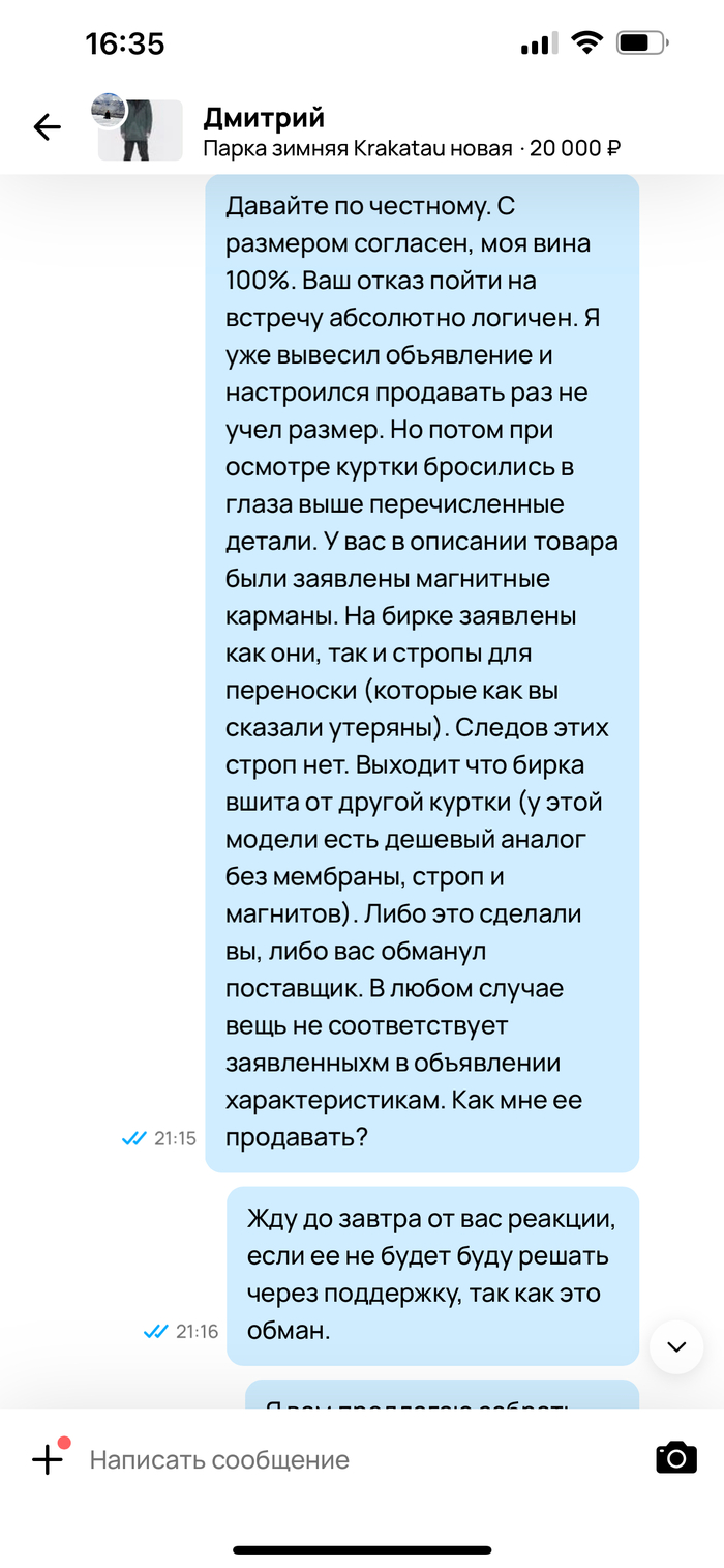 Дмитрий включил игнор. На мои сообщения больше он не отвечал. На следующий день, в субботу позвонил в Кракатау чтобы все таки найти правду - что за невиданный зверь мне попался. Тут стоит отдать должное оператору горячей линии конторы - суммарно он потратил на меня минут 20 времени, вникнув в суть проблемы и даже посочувствовав моей ситуации. Если коротко (как я понял) - куртка их, это не паль и не подделка. Скорее всего были отшиты тестовые куртки с характеристиками как на бирке и засланы иностранным представителям. Те внесли правки в модель, куртки перешились с учетом изменений и первые партии (возможно) с старыми (!) бирками по случайности поступили в продажу. Это если мы исключаем мошенничество в виде перешива бирок с дорогой модели на дешевую. Больше всего меня конечно же волновал вопрос наличия мембраны. Оператор сказал что мембрана однозначно есть, но ее параметры он в данный момент точно назвать не может. Посоветовал обращаться в Авито, так как продавец не предупредил меня о несоответствии товара заявленным характеристикам. Обратился в техподдержку Авито и оставил отзыв Дмитрию.