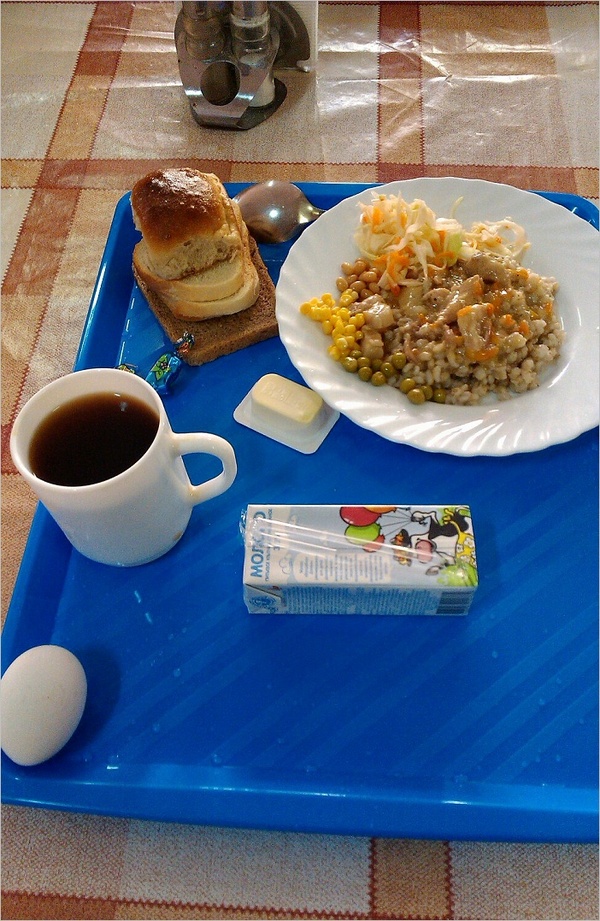 Типовой завтрак из солдатской столовой, где питаются военнослужащие отдельной бригады специального назначения ГРУ ГШ МО.