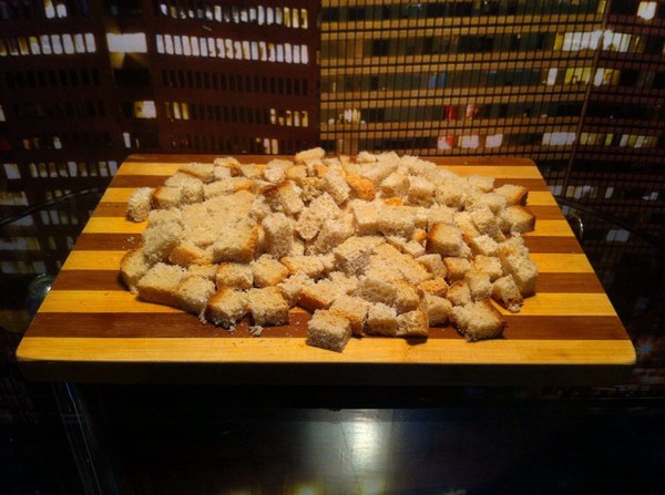 Хлеб нарезаем на сухарики. Получаются кубы 1см*1см*1см:-)