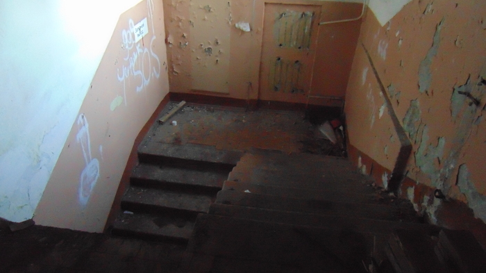 Поднимаемся по лестнице на второй этаж, которая, если не считать отсутствие перил и батарей отопления, почти не изменилась. Ну это и понятно, - металл - материал ценный! Ой, и что это за неприличное граффити у нижнего лестничного марша? Неужели тоже картинка из прошлого, когда горячие парни, особенно из солнечных республик, смотрели снизу вверх, в надежде увидеть что-нибудь интересное у поднимавшихся наверх молоденьких и медсестёр? Значит и стены непостижимым образом имеют память.