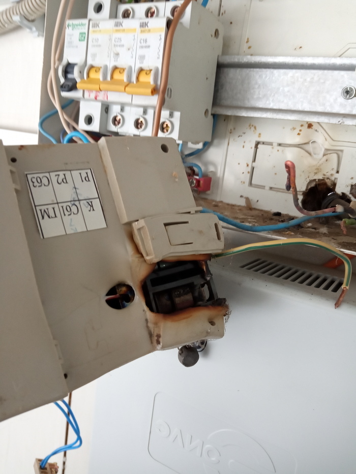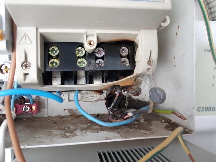 Видно фазный провод, точнее то, что там осталось, и потемневшие клеммы счетчика.