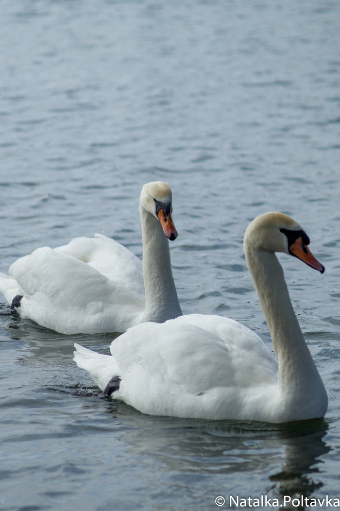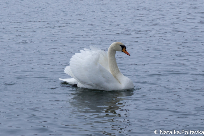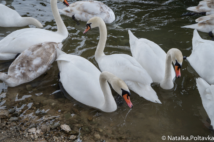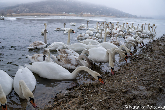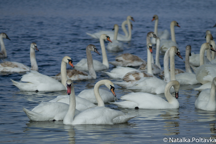 Большая стая лебедей временно поселилась на берегу в начале марта. Множество людей приходят полюбоваться и покормить этих прекрасных птиц.