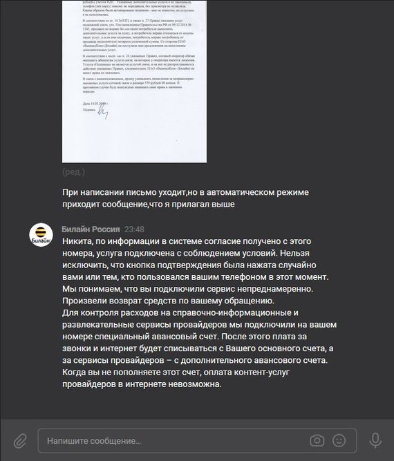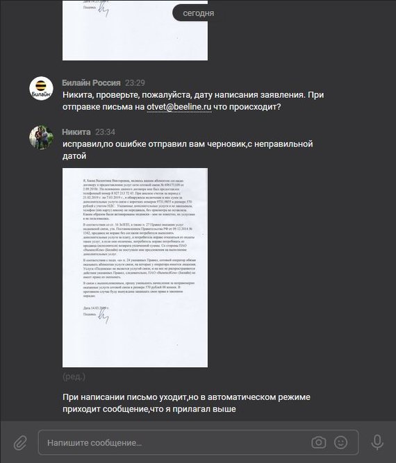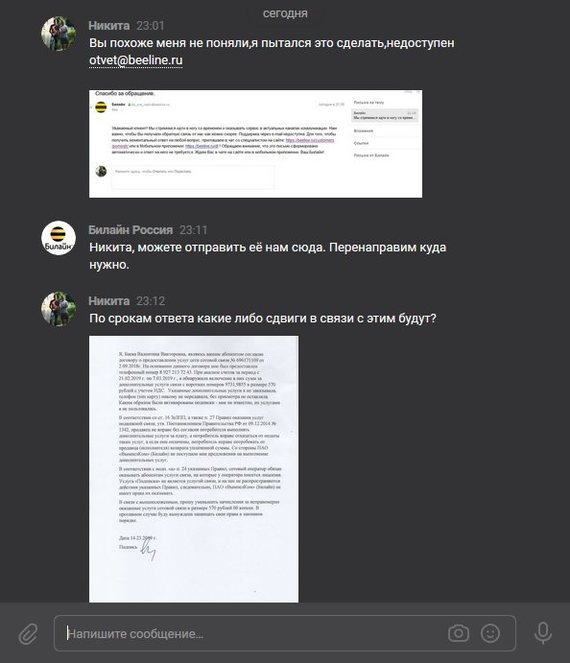 Почесав репу,решаю не сдаваться,деду же уже обещал,пишу уже письмо на бумаге,где излагаю,почему Билайн редиски,где они не правы,и что вообще,все эти списания как бы незаконны,распечатываю все это,заверяю подписью и пытаюсь отправить .Но я недооценил хитрость гуков, otvet@beeline.ru,куда по логике вещей и нужно отправлять скан письма,приказал долго жить...В голове прозвучал голос Димки с его коронной "денег нет,но вы держитесь", ну думаю,хрен с вами,иду в оф. группу ВК Билайна и там пишу,мол ребят,тут как бы это,почта ваша того...на что мне(как я думаю) ударяя себя в грудь обещают разобраться прям тут.