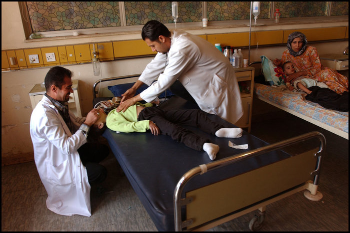 4. Апрель 2003, Багдад - - - в больнице Аль-Асскан в Багдаде два врача выполняют массаж сердца 10 летнему ребенку Воруду Насиафу, который все же умер несколько минут спустя.